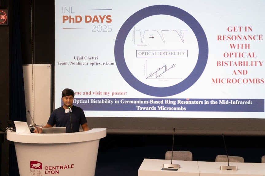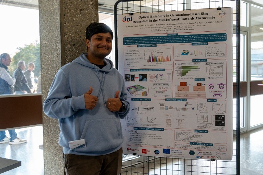 At Journées des doctorants de l’INL, 2025 (https://inl.cnrs.fr/phd-days-2025/), held in INL, Lyon, from 6th of November to 7th of November 2025, doctoral fellow Ujjal Chettri presented a poster to share his work on “Optical bistability in germanium-based ring resonators in the mid-infrared”. Every year the Institut des Nanotechnologies de Lyon (INL) organizes Journées des doctorants de l’INL, also called as the INL PhD days. This two-day event is dedicated to the research work of the laboratory’s doctoral students. The doctoral students of the end of the first year present their work in the form of posters, and the doctoral students of the end of the second year give oral presentations of 10 minutes followed by questions. Former INL PhD students are also invited to come and present their experiences and post-doctoral journeys to the new generation. PhD days are an opportunity for PhD students to practice scientific communication, to value their work internally, and to benefit from relevant scientific discussions for their projects with other members of the laboratory. These two days also make it possible to find a global and multidisciplinary vision of the research of the INL through the diversity of doctoral projects.